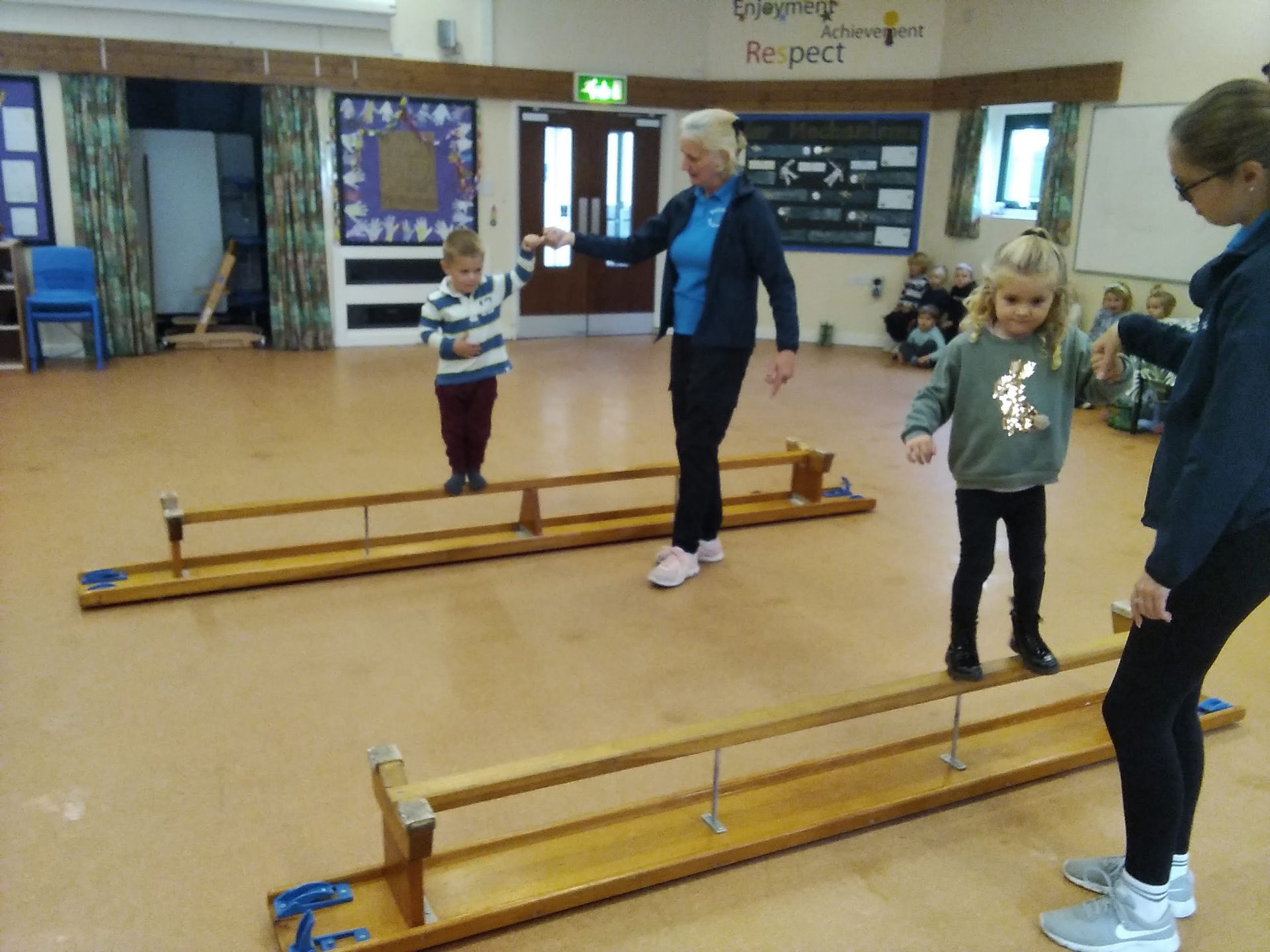In P.E. we moved like different birds - swifts that fly away (migrate- this word was introduced to the c hildren), ostrichs that can't fly but have long necks and peck the ground and we waddled like penguins. Finally, we developed the children's balancing skills by walking along the bar at the bottom of a bench like birds walking on a wire.
