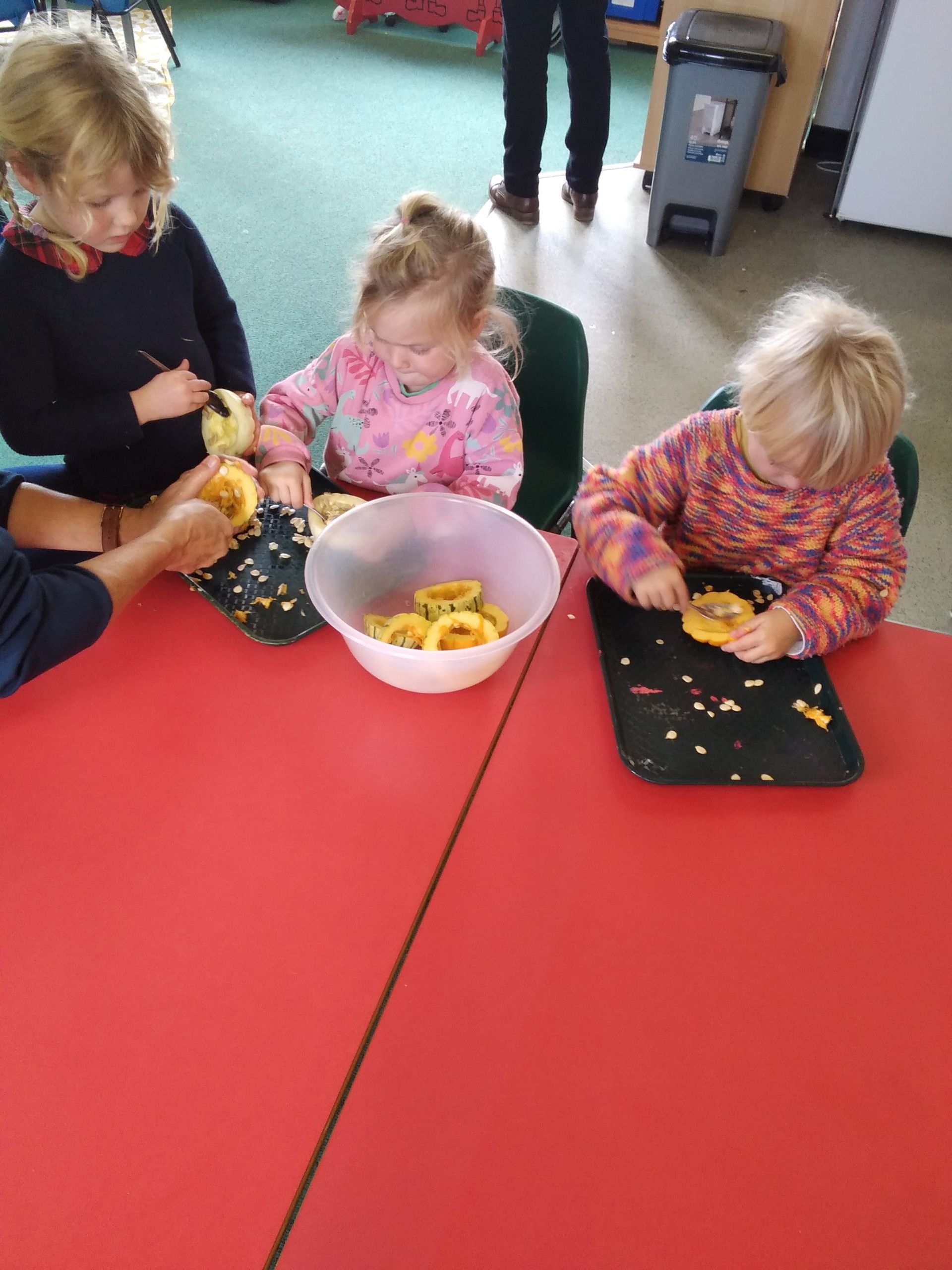 The children made another papier mache pumpkin with Ruby, which they then painted orange, added faces and hung from the ceiling. They look very cute!