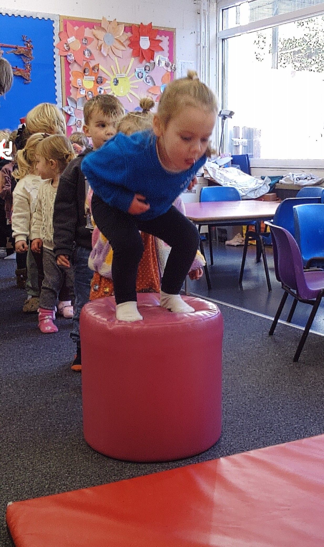 We have found lots of ways to entertain ourselves, mainly indoors due to the horrible weather. As we couldn't use the school hall on Tuesday we played musical status and bumps in the classroom, in preparation for our Christmas party. The children also love jumping off of the footstool onto the mat. They were all great at climbing onto the stool with ease and jumping off in a variety of ways. The tricky bit was getting the children (especially the little ones to walk to the back of the queue and stay there). On the second occasion and with the assistance of the older children they did all manage it. Well for a very short time!