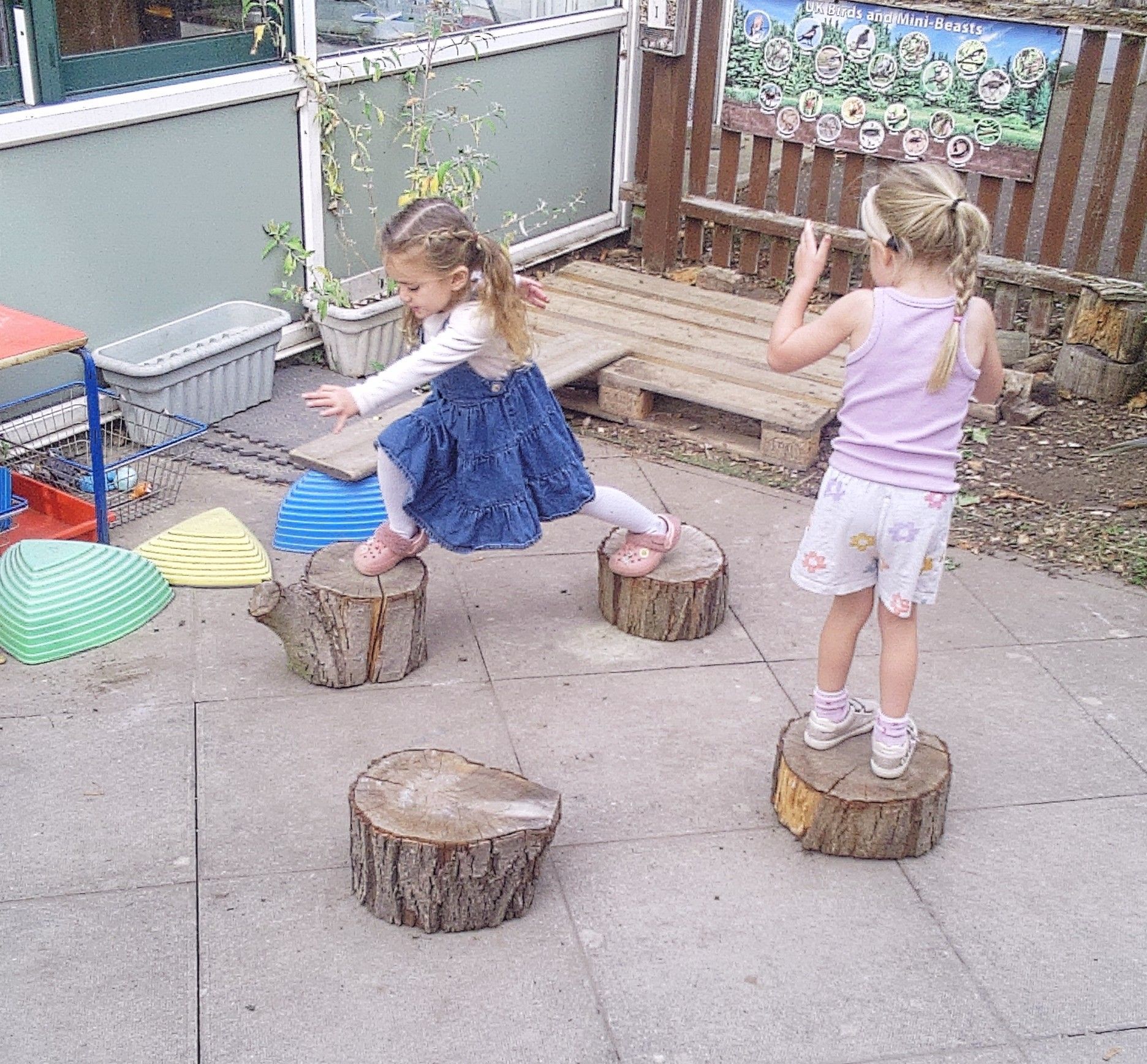 We decided to bring the tree stumps into our new play area from the garden and had lots of fun with them and the plastic stepping stones. Using both to develop our balancing and jumping skills.