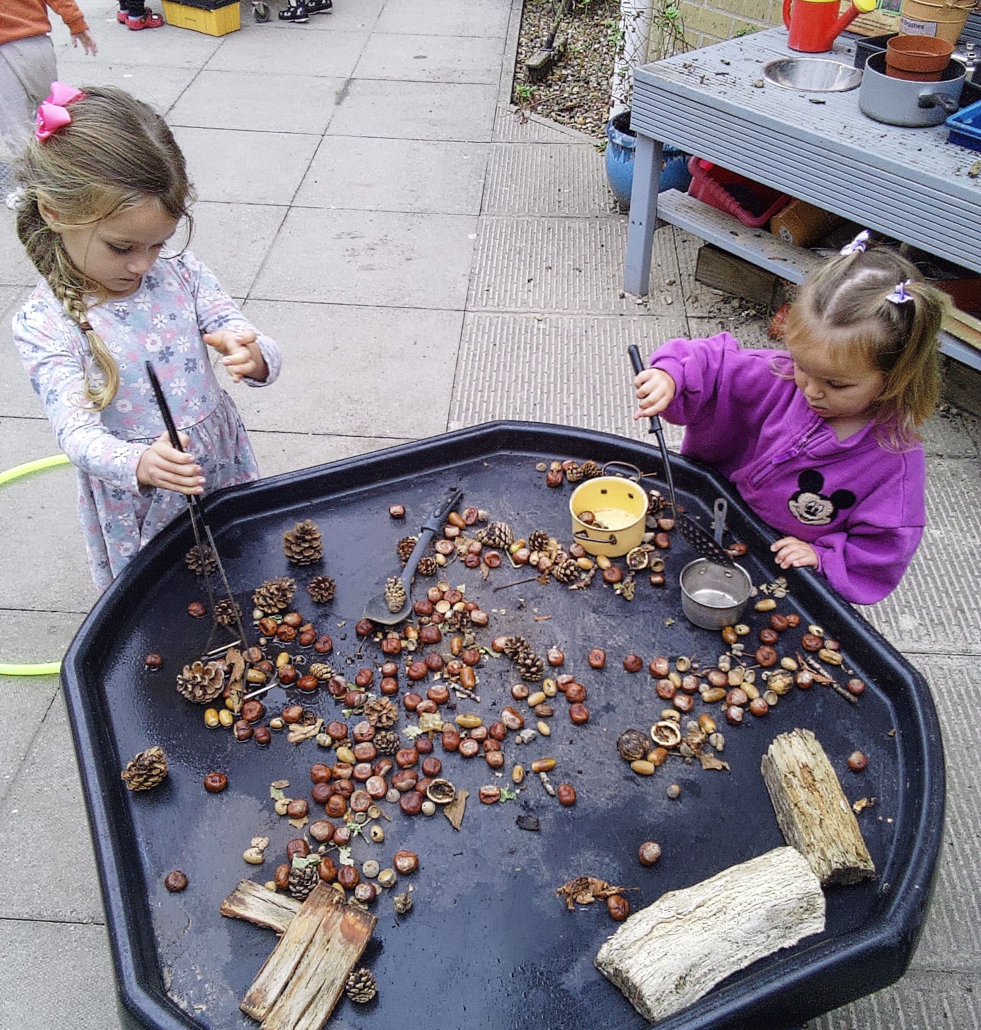 Rather than pasta we decided to use the items we had collected from nature and we were very impressed with how well the children used the tongs to move the conkers around as well as the laddles and spoons, developing their fine motor skills.