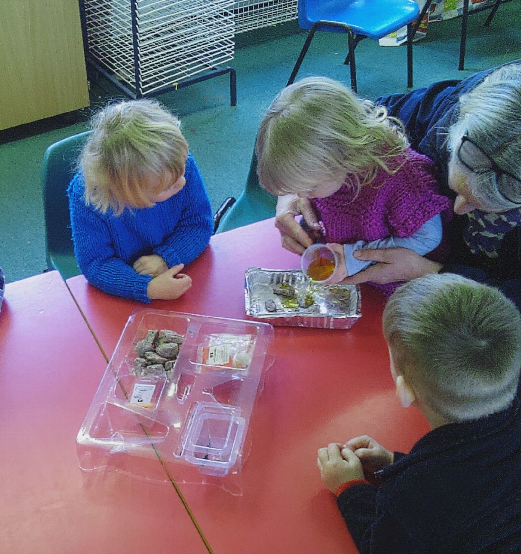 We continued our dinosaur focus, as we loved it so much last week, but we looked more at the environment the dinosaurs lived in. So we had a go at creating some volcanos. We tried lots of different combinations including coke, water, vinegar and milk for the liquid alongside bicarbonate of soda and mentos as the component that would make the volcano explode or bubble. Initially lots of the children thought the coke would make the explosion but they discovered it was the vinegar and bicarbonate of soda that created the best reaction on day one. On day two we tried a different vinegar that made really good bubbling lava.