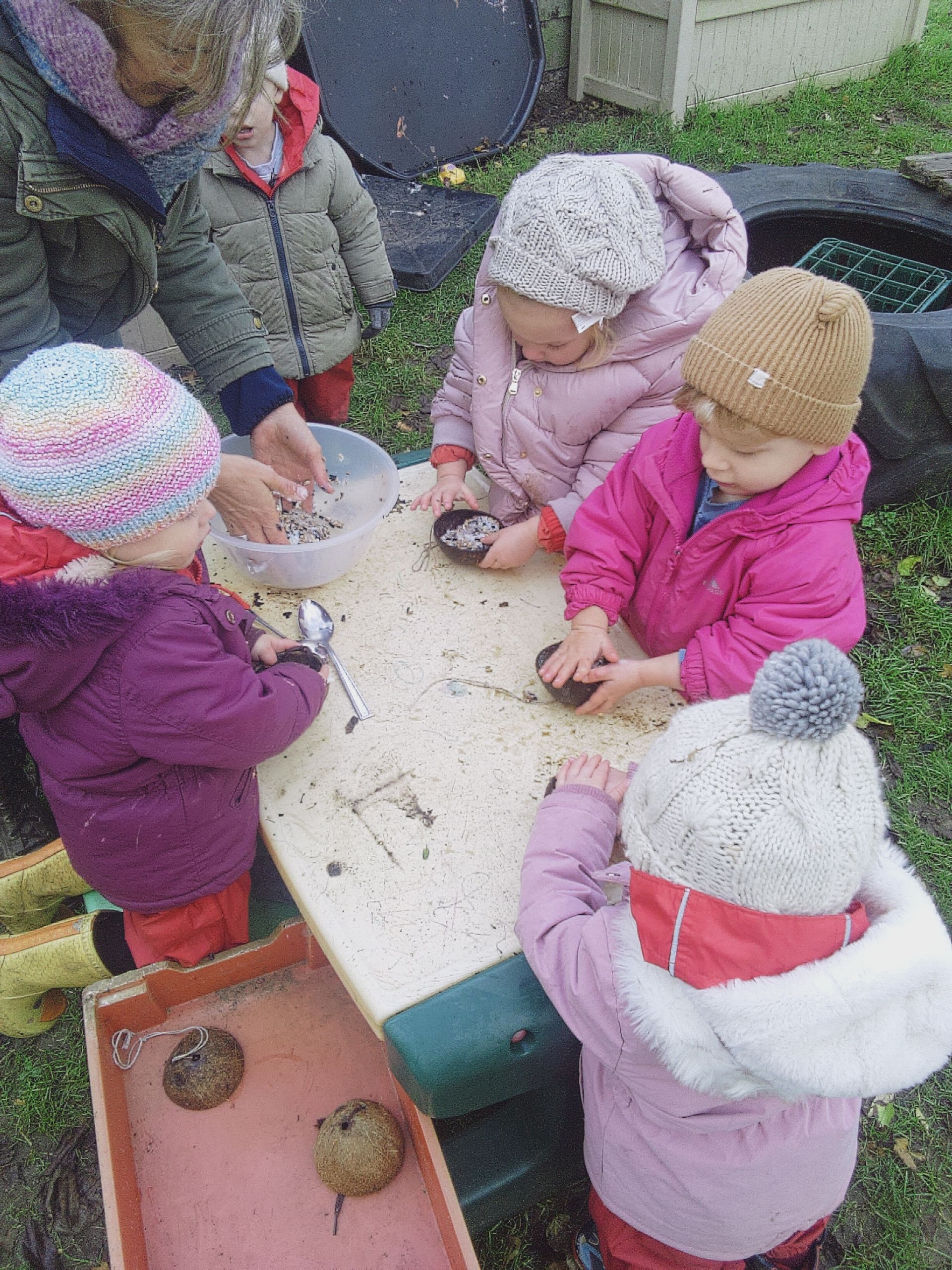 We were in the warm on Monday (it was very raining) so we did painting with a big piece of paper on the large table as well as playing in the tunnels and on the mats. On Tuesday we played parachute games in P.E. and spent time in the garden making sure we are looking after the birds during the cold snap by filled up the bird feeders.
