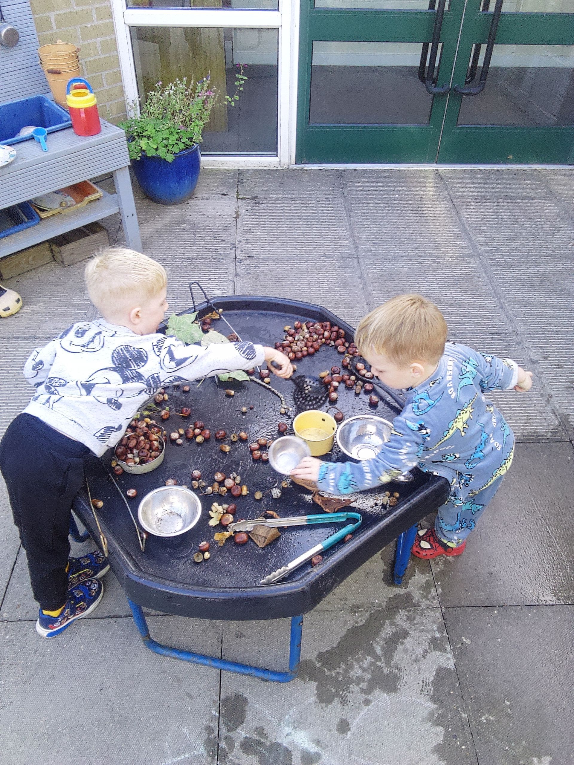 The Autumn collection has also been a feature of our outdoor play in the builders tray. They have been multi-functional - transferred from container to container, scooped up with spoons and ladles, used to make a dinosaur world and as part of a painting activity.
