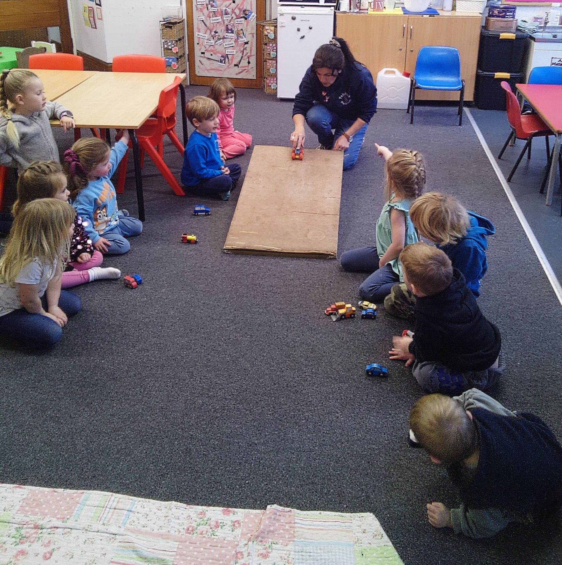 Alfred brought his dinosaur monster truck in, which he showed and then we all took part in a competition to see who could get it to go the furthest. Theo was the winner, closely followed by Rebecca!
