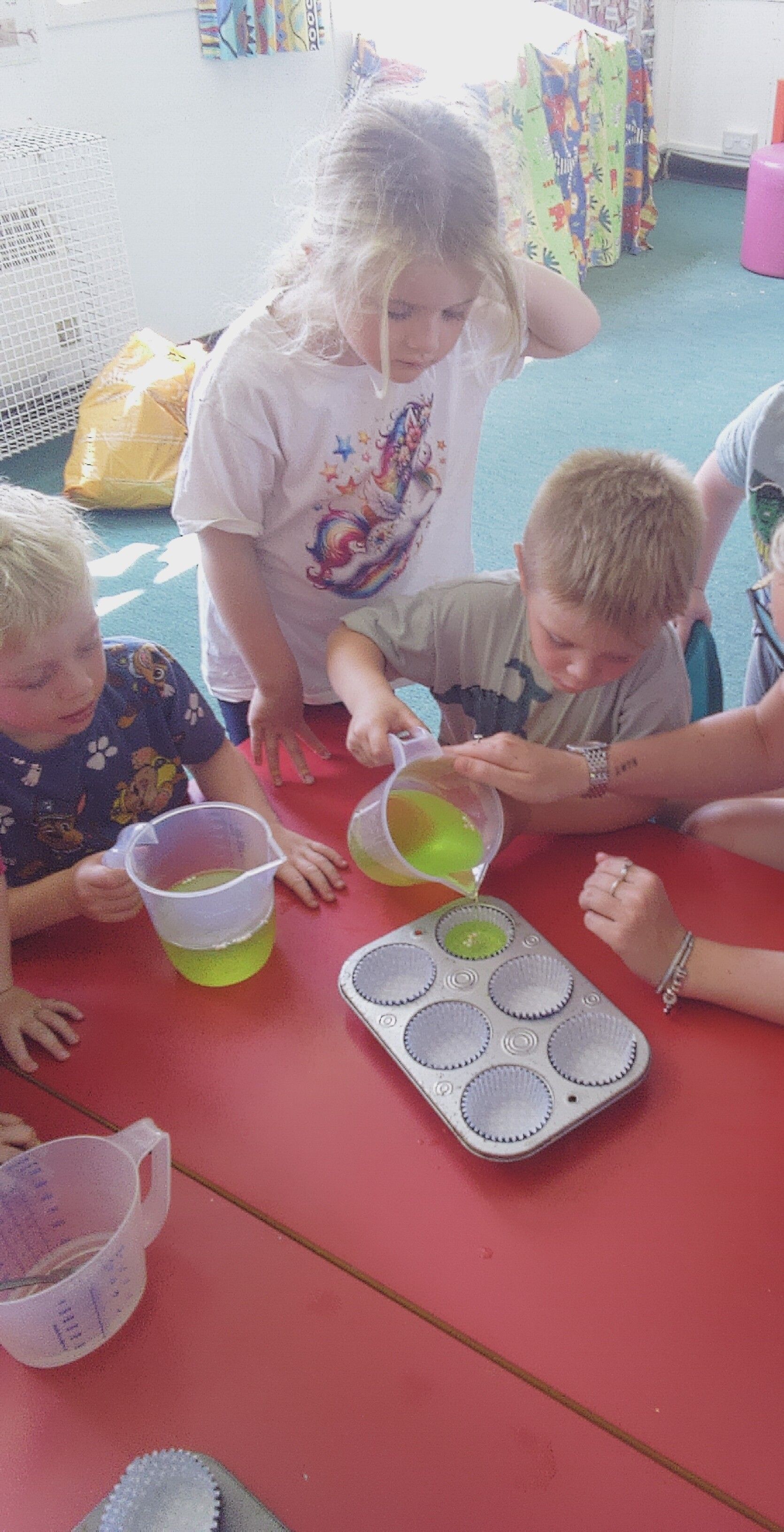 We have had a very messy time being involved in activities relating to sealife. The beach we made in the builders tray started well, but then a tsunami hit (the children) and it ended up looking more like a swamp. The swamp theme followed on into the sealife jellies with sprinkles, that should have respresented fish. They didn't quite go to plan. However, the children did love eating them for afternoon snack.