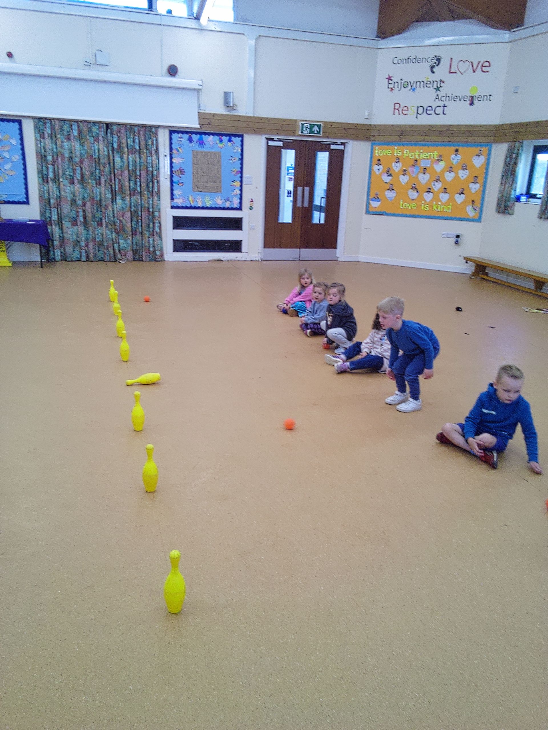 In P.E. we tried something new - rolling a ball at a skittle in pair. Some of the children were very good at it. Alivia and Morgan were paired together and knocked down the most skittles.